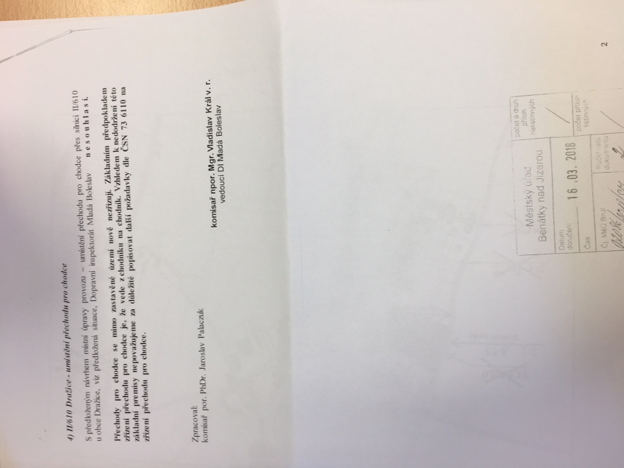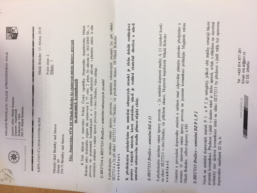 Minulýtýden jsme byli na jednání se zástupci města a obdrželi jsme zamítavé stanoviskoz Krajského ředitelství Policie SK k našemu požadavku na doplněníznaček a zrcadel v Dražicích.